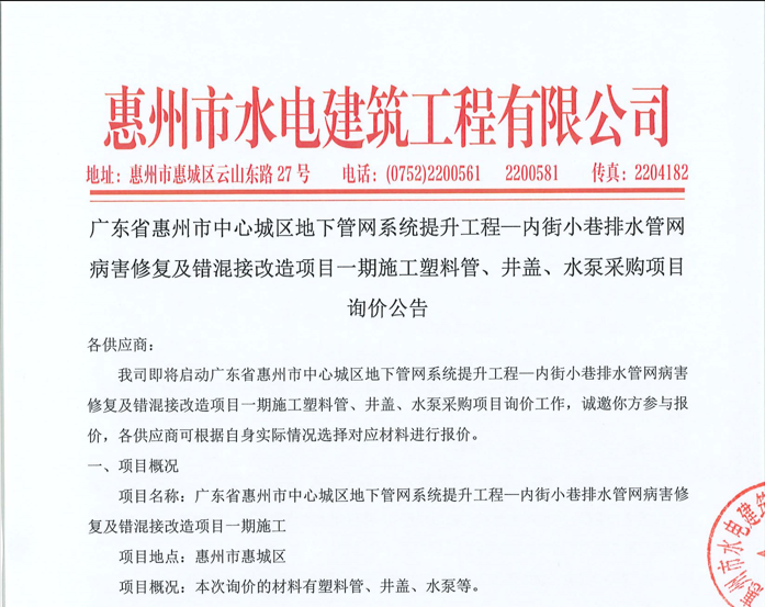 廣東省惠州市中心城區(qū)地下管網(wǎng)系統(tǒng)提升工程-內(nèi)街小巷排水管網(wǎng)病害修復(fù)及錯混接改造項目一期施工勞務(wù)采購(第二次)中選候選人公示……