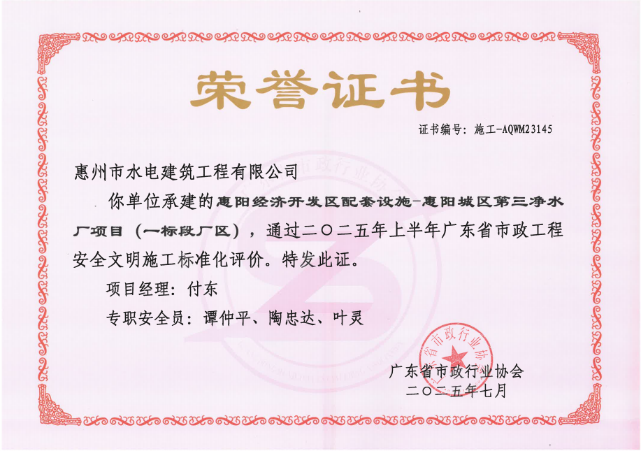 惠州市水電建筑工程有限公司成立于一九六四年四月,隸屬惠州市水務(wù)集團有限公司,是一家國有綜合性施工企業(yè),主營水利水電工程、房屋建筑、市政工程等施工業(yè)務(wù)。公司擁有水利水電工程施工總承包一級、建筑工程施工總承包一級、市政公用工程施工總承包一級、公路工程施工總承包三級,公路路基、路面及建筑裝修裝飾專業(yè)承包二級,環(huán)保工程、機電安裝、河湖整治、輸變電工程專業(yè)承包三級等經(jīng)營資質(zhì)……